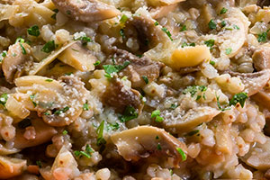 Det tager ca. 20-25 minutter. Kog derefter ind til passende konsistens, tilsæt granaost, de ristede svampe og de blancherede porretoppe.
